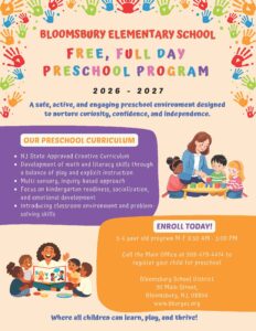 2026/2027 registration is open for FREE Universal Preschool for Bloomsbury School District residents. If you have a child or know of a child who will be 3-years old for Preschool on or before October 1, 2026, please call the school office at 908-479-4414, or email Lisa Hutchison at lhutchison@bburyes.org.